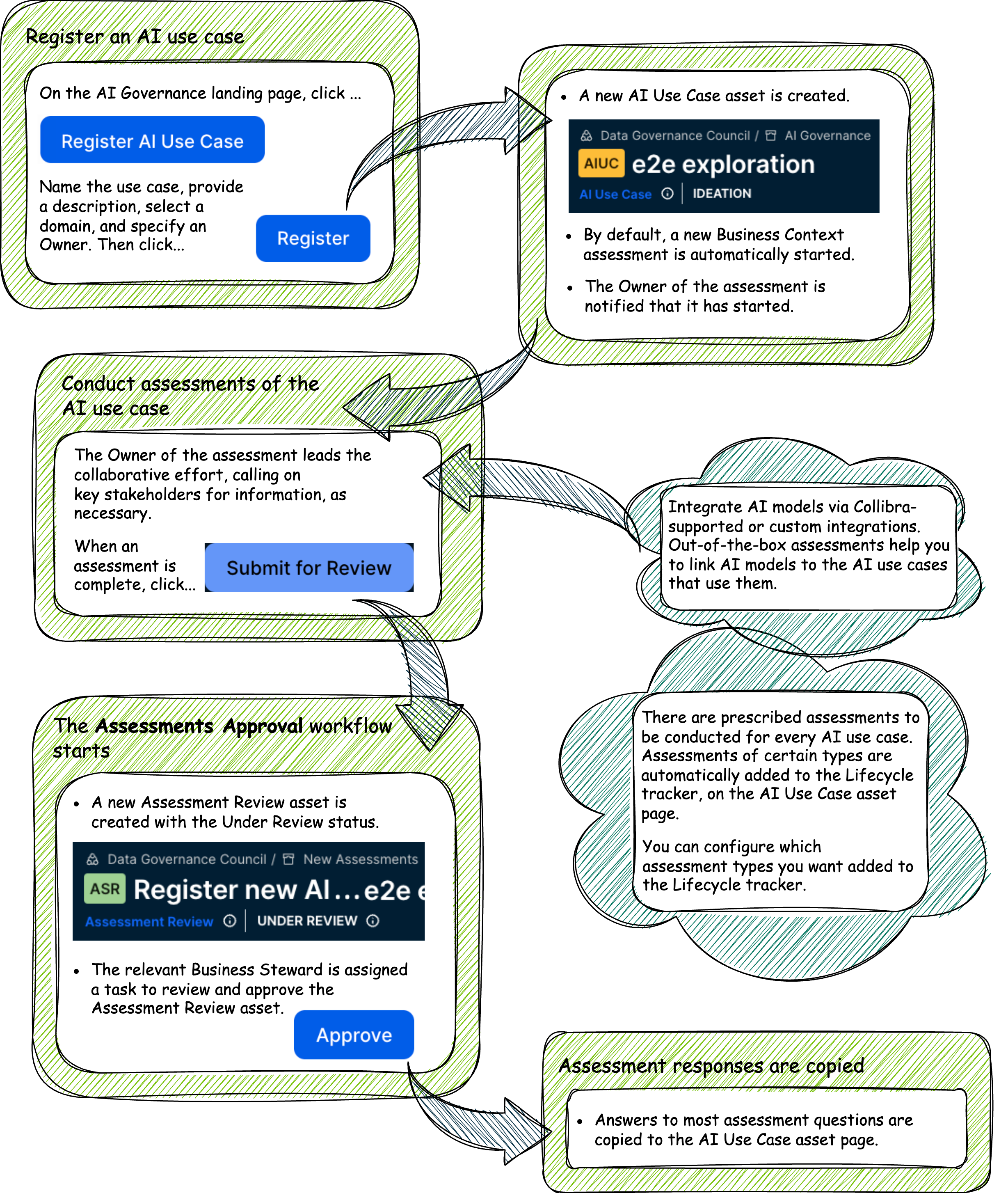 This topic describes the Collibra AI Governance process flow, from registering an AI model or AI use case, to collaborating to assess the AI model or AI use case, and finally approving the Assessment Review asset.