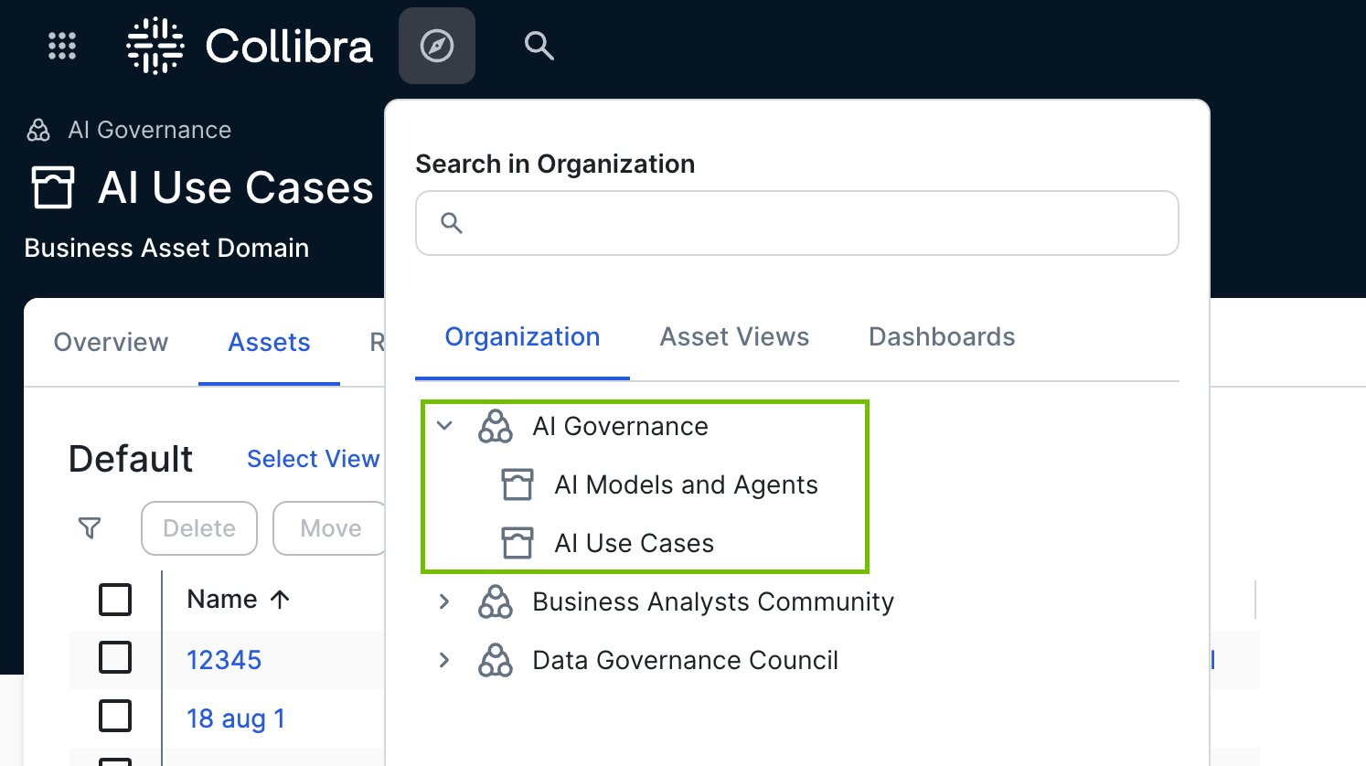 You're free to create new domains or use other existing domains to store your AI Governance-related assets. Just be aware of the different domain types: Technology Assets type for AI Use Case assets; Business Assets type for other assets.