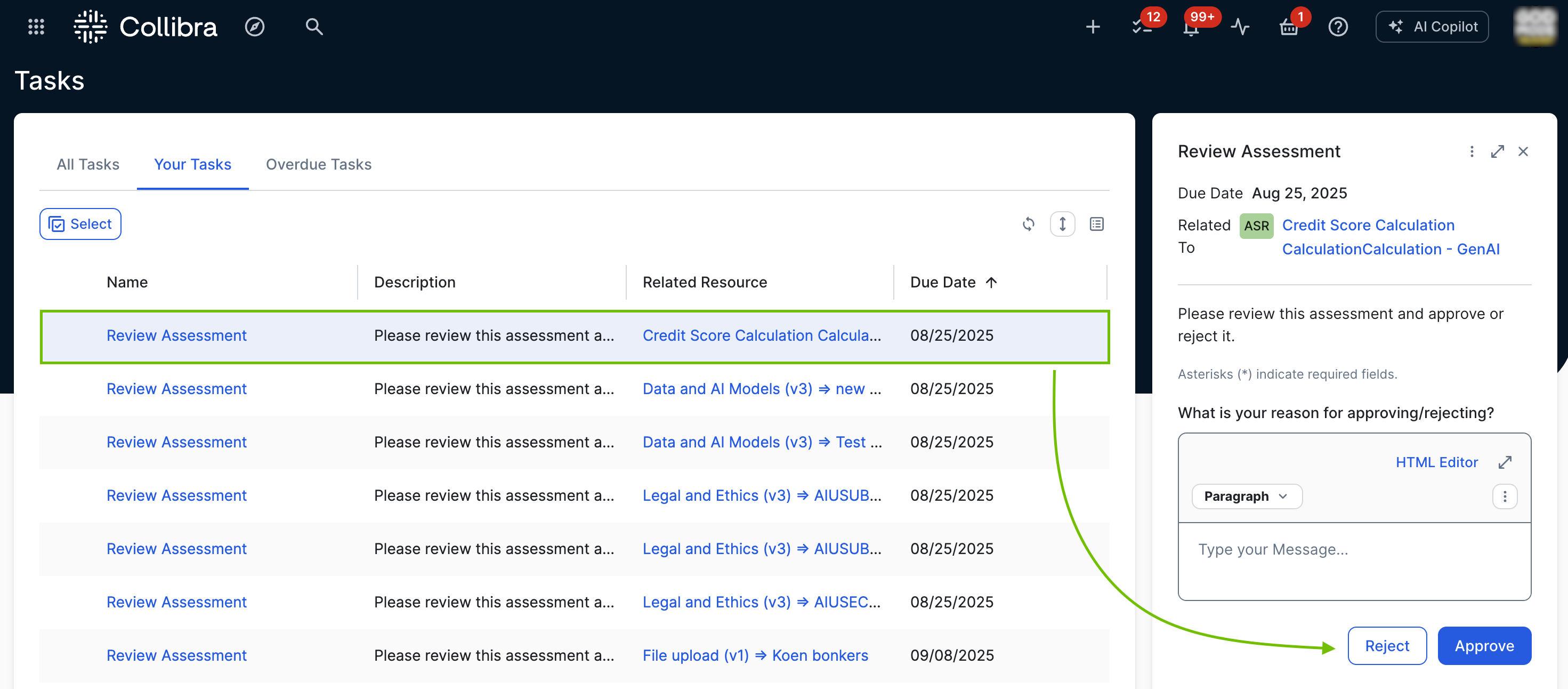 - The Assessments Approval workflow is triggered and the Business Steward for the domain receives a task to approve or reject the Assessment Review asset.