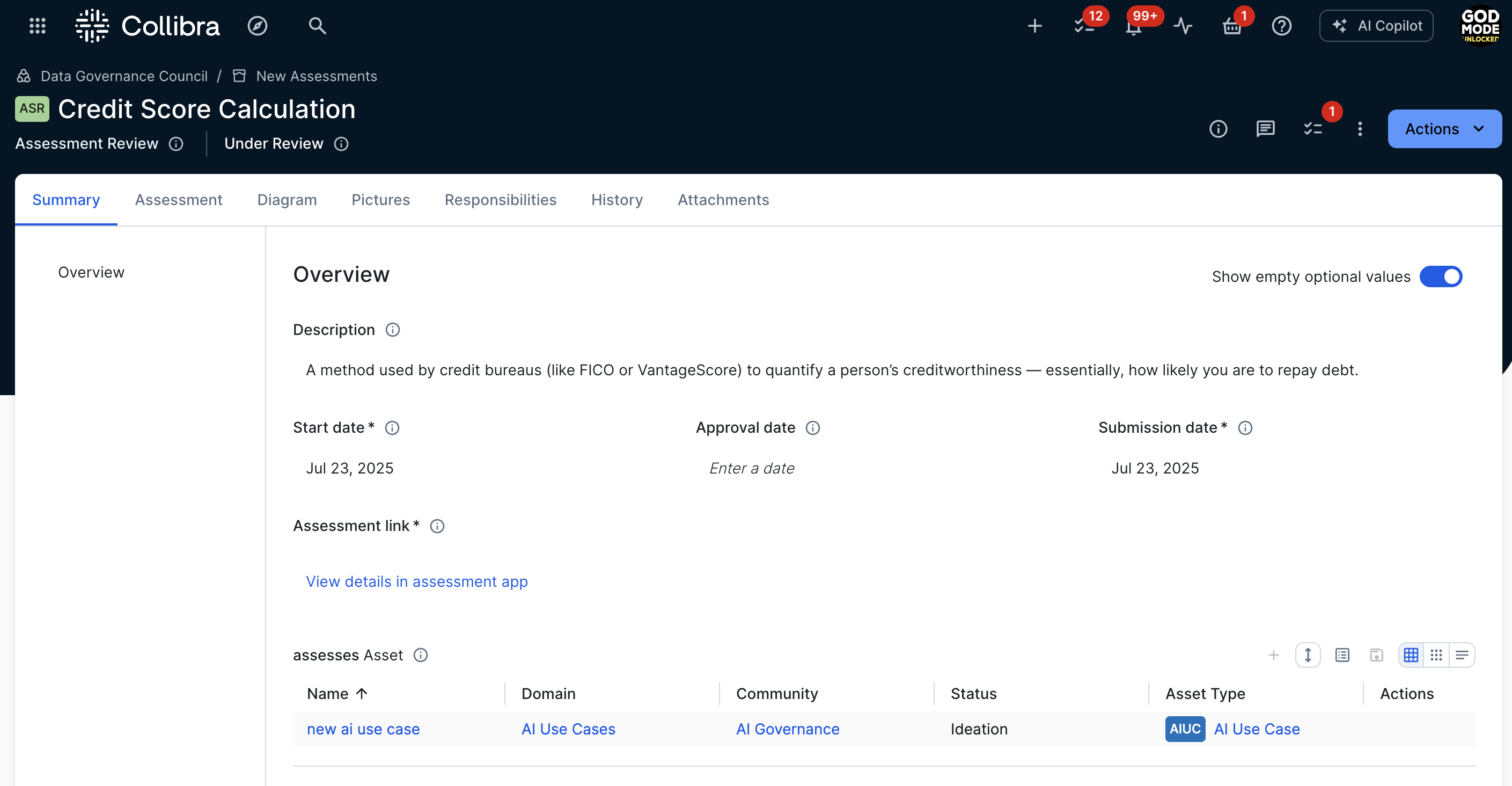 An Assessment Review asset with the status Under Review is created in your Collibra environment (if the Require a review option was selected in the template that was used to conduct the assessment), in the domain of their choice.