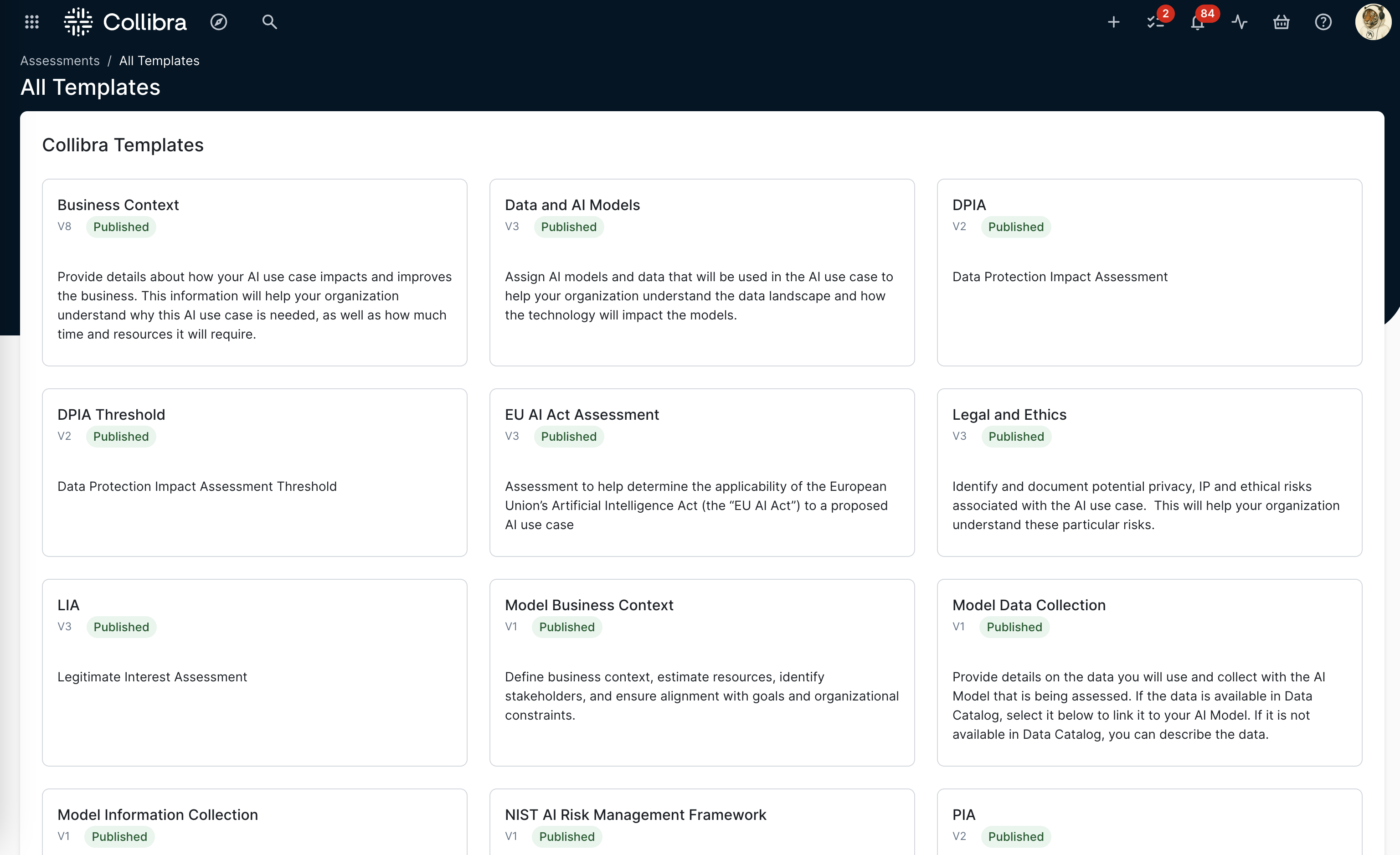 Collibra comes with the following out-of-the-box assessment templates: