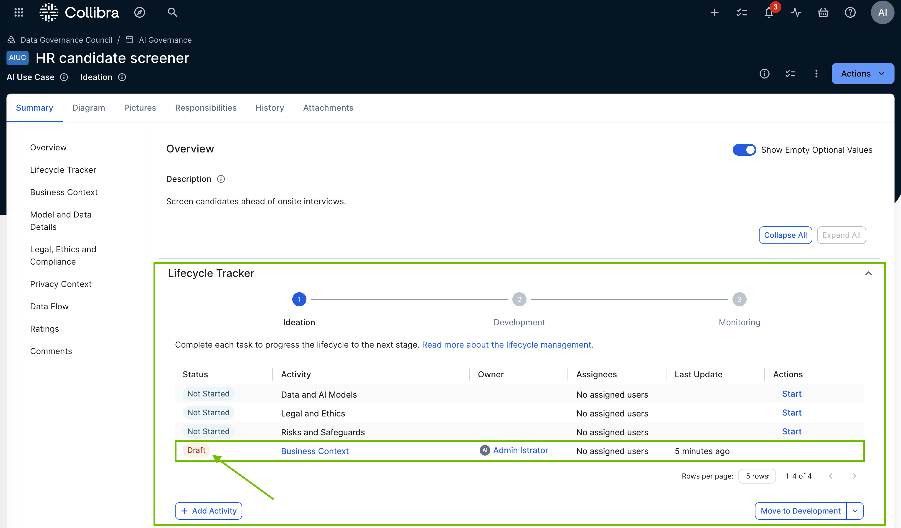 As shown in the following example image, the Draft status of the Business Context assessment identifies that it is started.