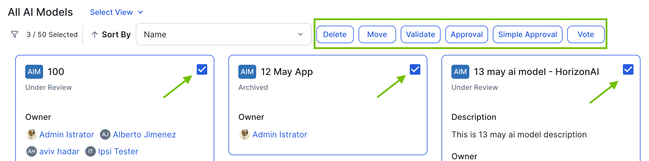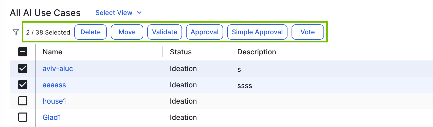 As shown in the following image, if you select one or more AI use cases, you are presented with options to delete or move the AI use case to a different domain, or start a workflow.