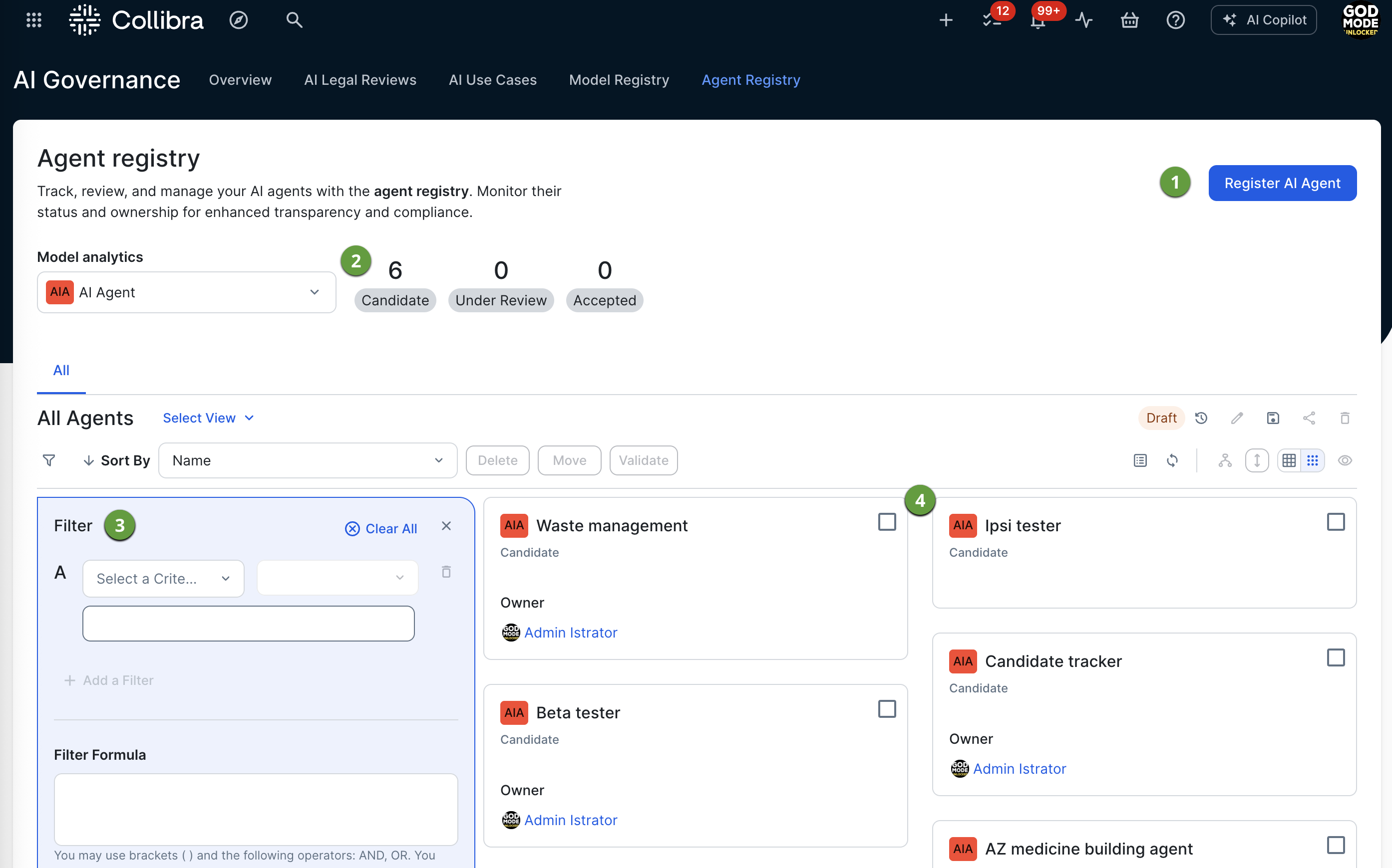 The Agent Registry page allows you to track, review, and manage all Al agents (and assets of child asset types) in your Collibra environment, for better transparency and compliance.