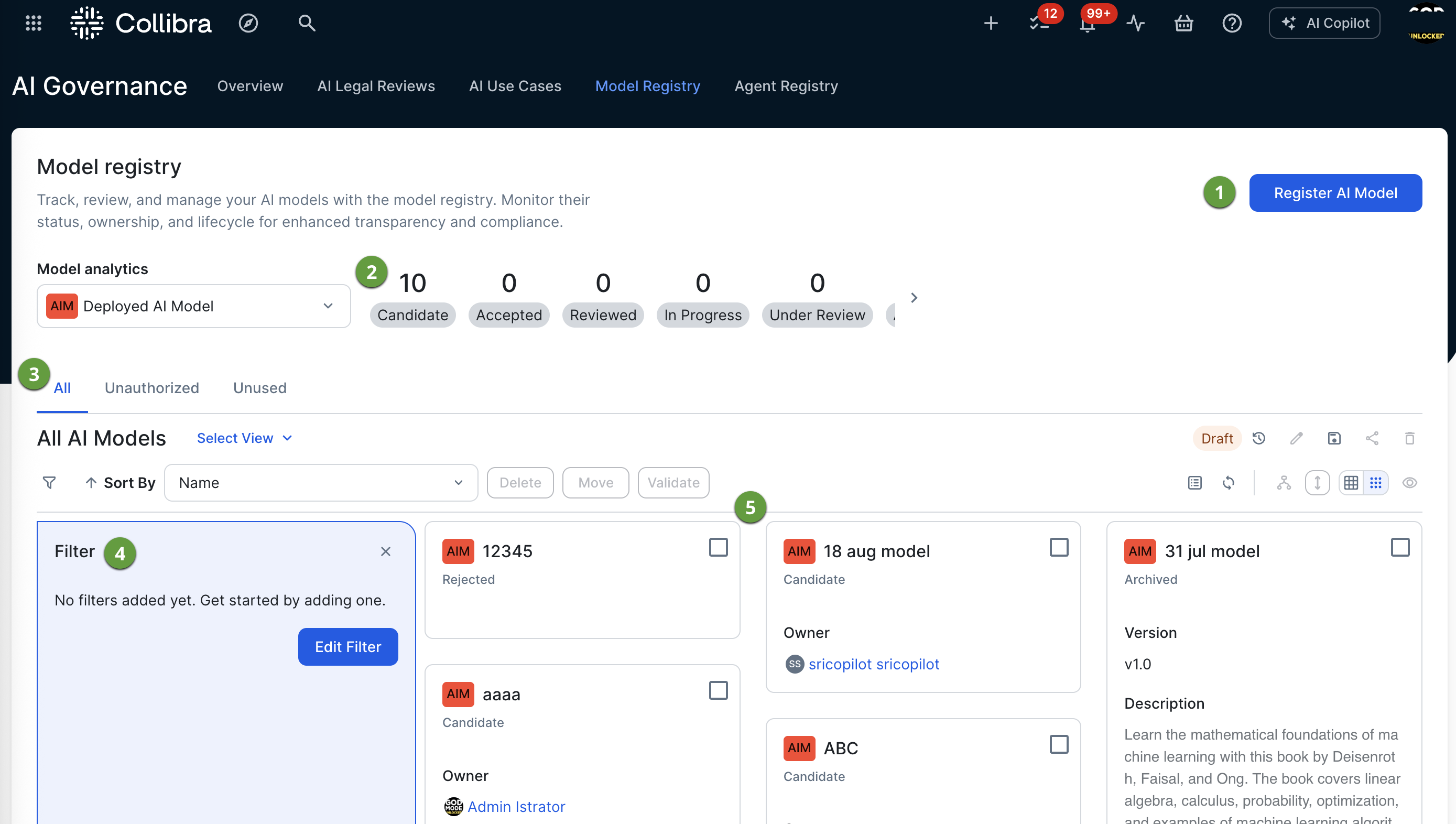 The Model Registry page allows you to track, review, and manage all Al models (and assets of child asset types) in your Collibra environment, for better transparency and compliance.