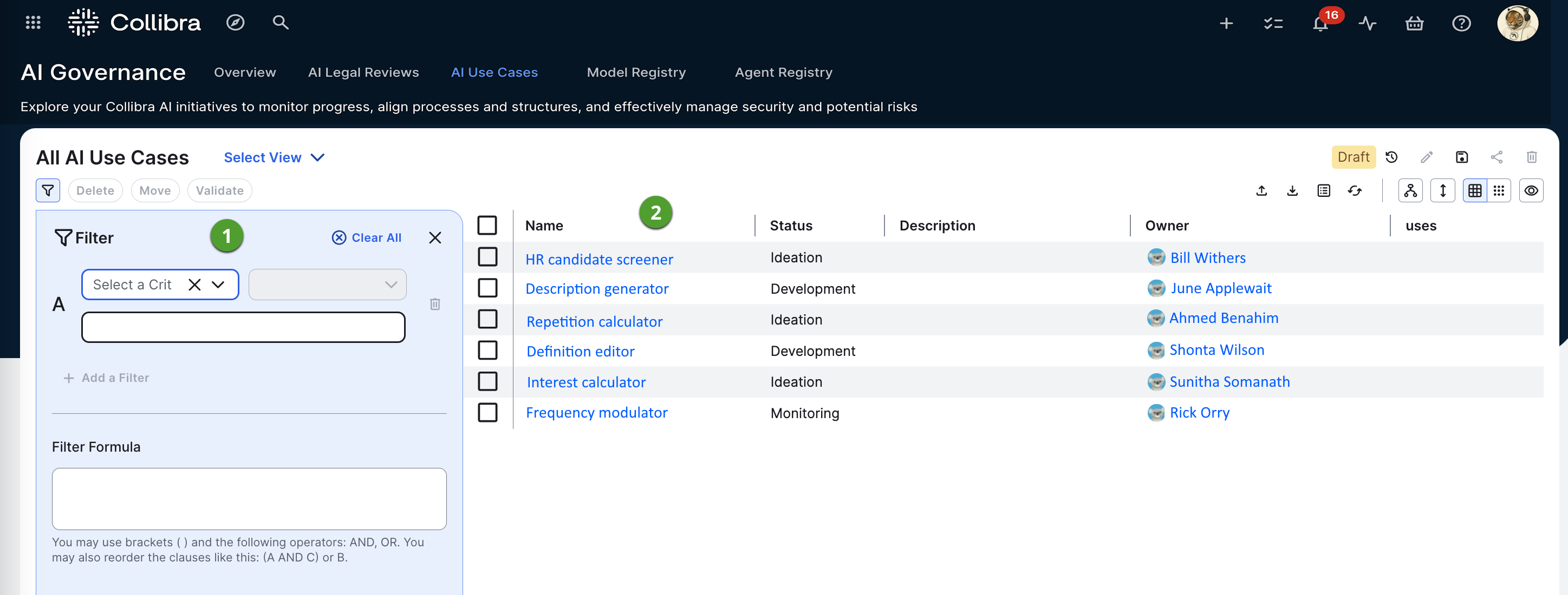 The asset filter enables you to quickly find the AI use cases you want by limiting the number of AI Use Case assets shown in the view. |