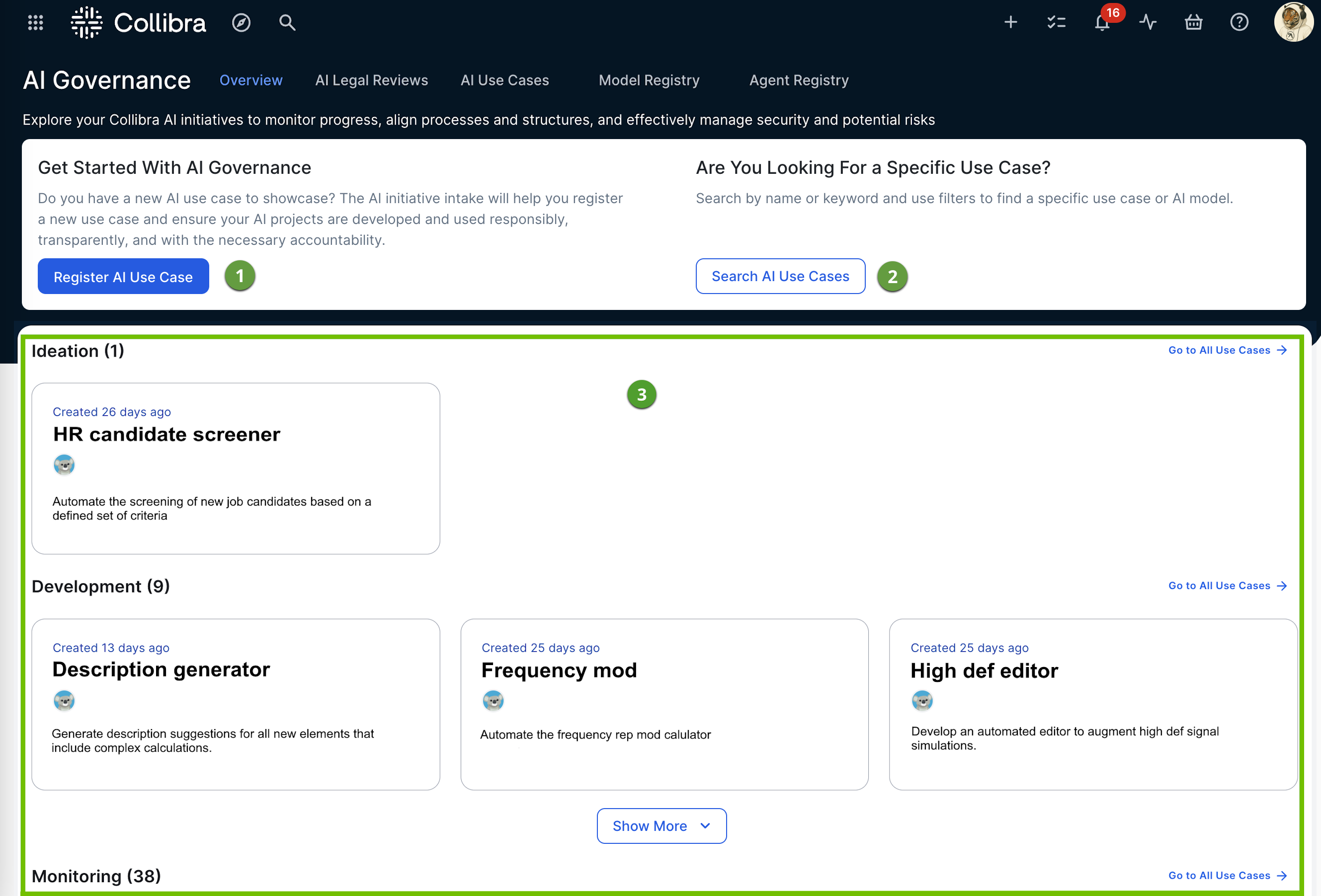The AI Governance Overview page allows you to view up to 50 existing AI use cases, search for AI use cases, and register new AI use cases.