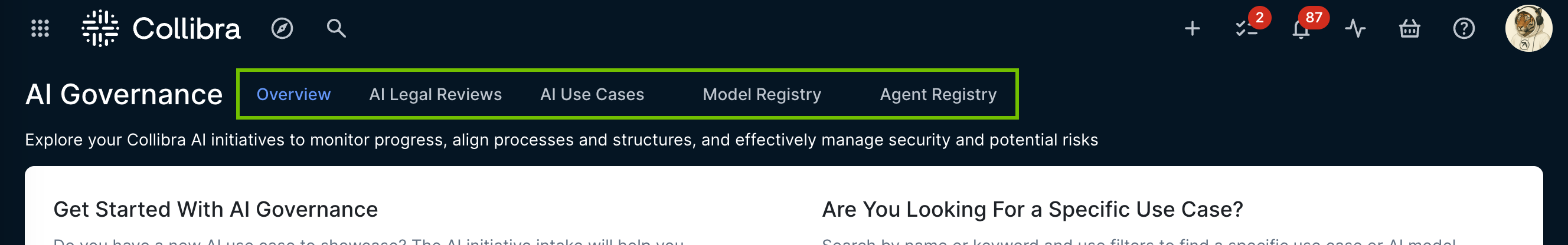 When you open AI Governance, you arrive at the Overview page. Across the top of the page are links to other AI Governance product pages, including the AI use case, AI model, and AI Agent registries.