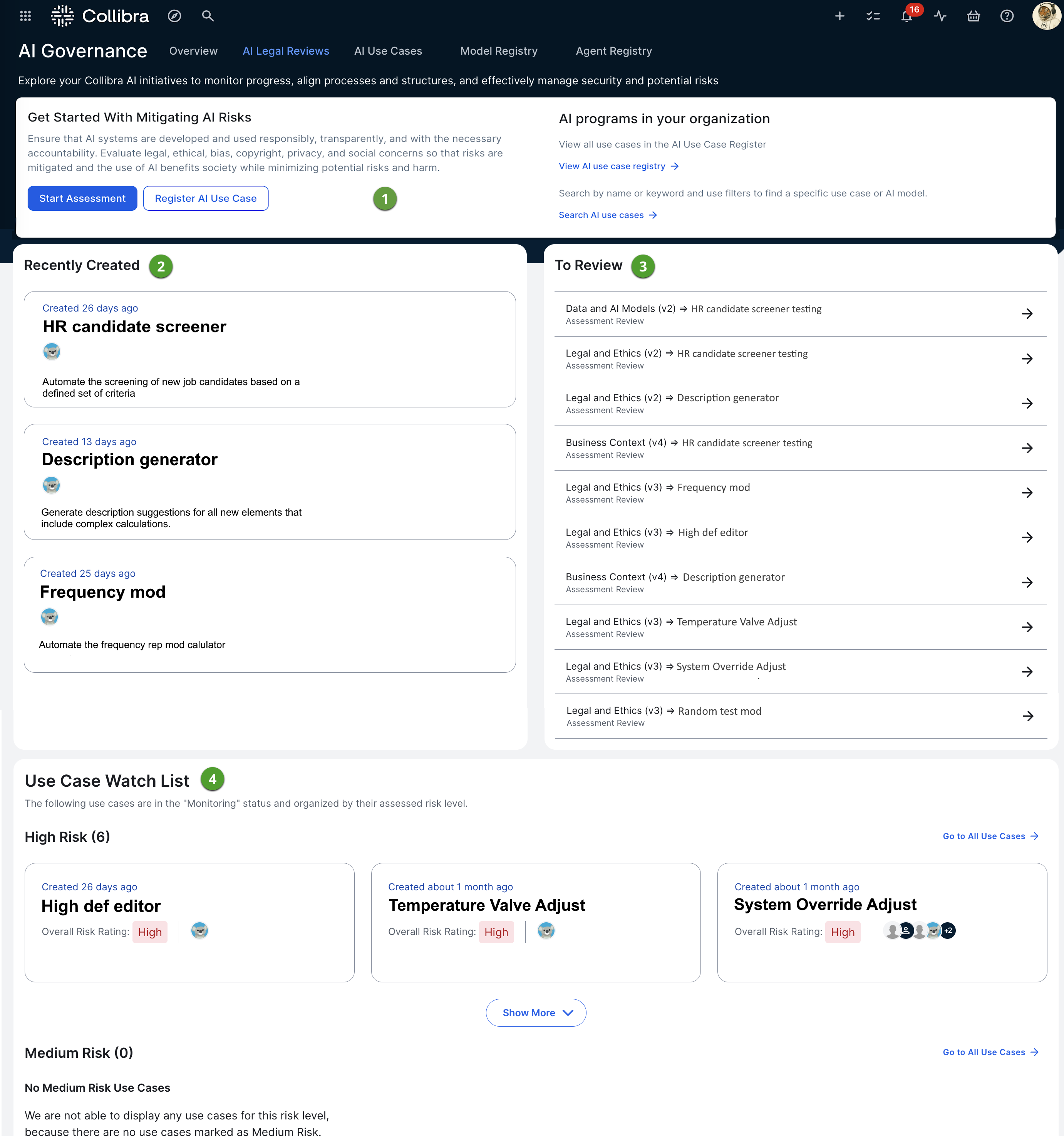 The AI Legal Reviews page allows you to start assessments on new AI use cases, monitor existing and newly created use cases, register new use cases, and see which review tasks are awaiting action from you.