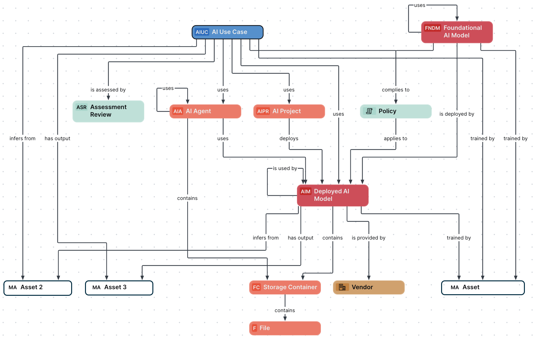 The following image shows the relations between the AI Governance asset types and other relevant asset types.