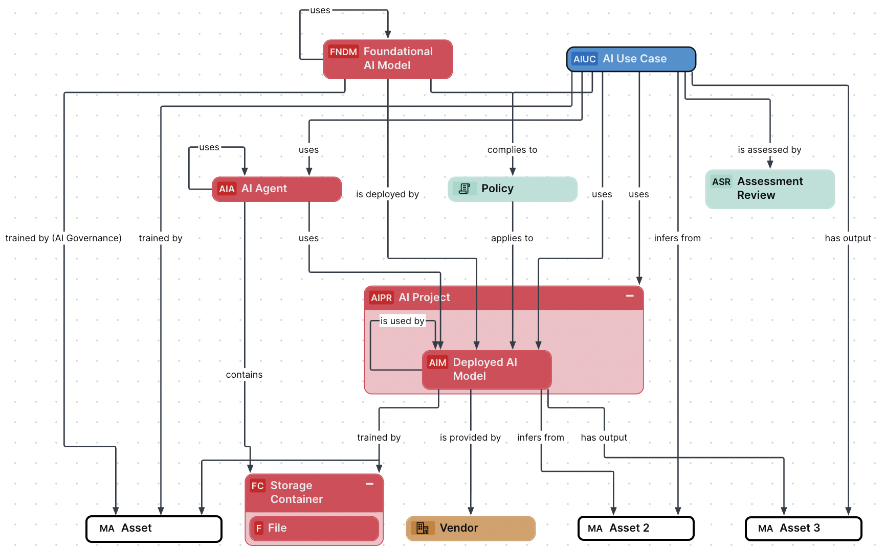 The AI Governance operating model includes the following AI Governance-specific asset types: