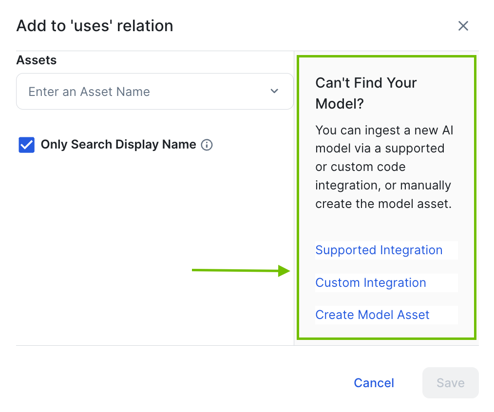 When you're linking a AI model to your AI use case, all relevant Deployed AI Model assets appear in an Assets drop-down list. But what if you can't find your Deployed AI model?