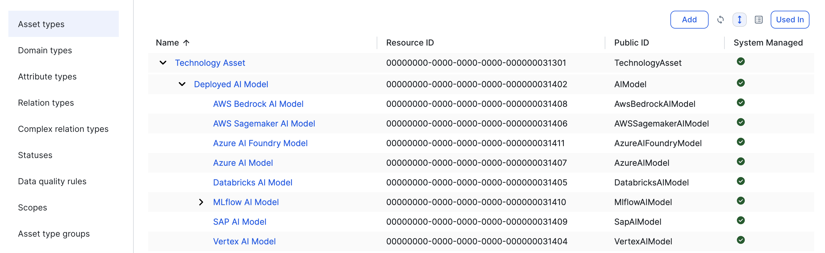 These integration-specific asset types are child asset types of the Deployed AI Model asset type.