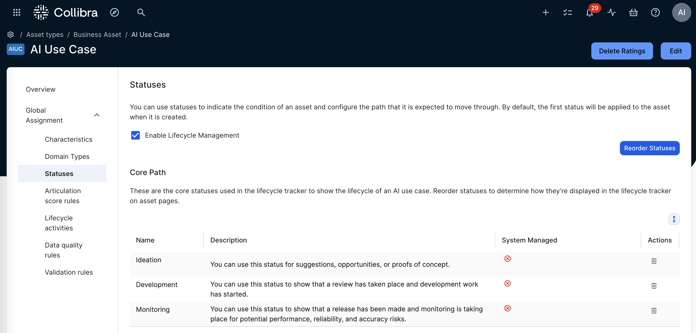 For any asset type, you can configure which initial status you want assets to have when they are created. For some asset types, including the AI Agent, Deployed AI Model, and AI Use Case asset types (and child asset types), the Enable lifecycle management option is available in the global assignment. This option allows you to configure an asset status progression that represents the lifecycle stages through which assets of that type will evolve.