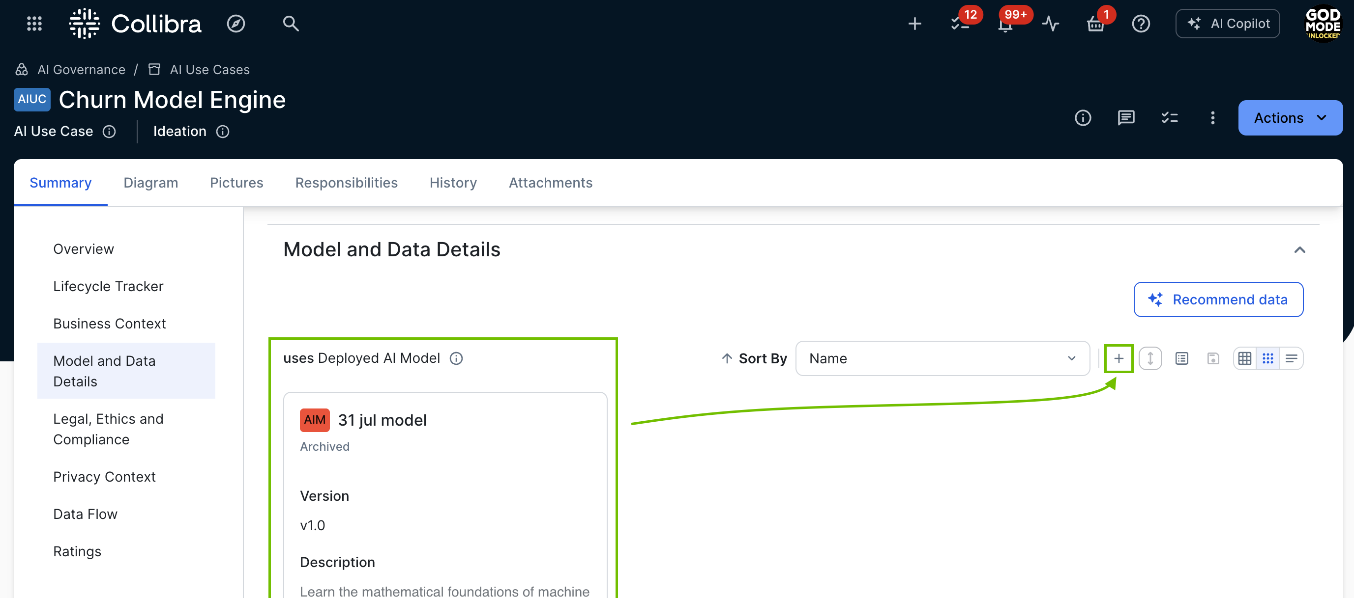 In the following procedure, we'll show you how to add a relation between an AI use Case and an AI Model that it uses. You can follow this procedure to add relations of different types between assets of different types, for example between one AI model and another AI model, or between an AI model and an AI agent.