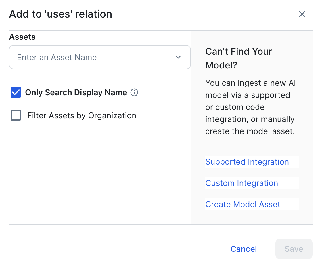 Note Only Deployed AI Model assets that have the status Accepted are shown in the drop-down list.Only Search Display Name - Select this option to show the display names of assets in the Assets drop-down list.
