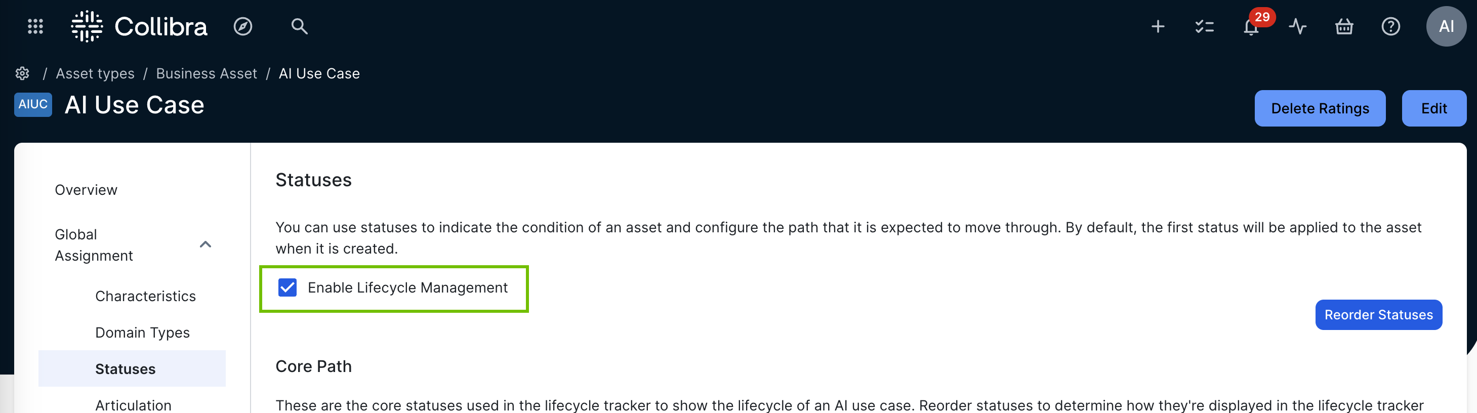For complete information, go to Configure the lifecycle stages of AI Governance assets. |