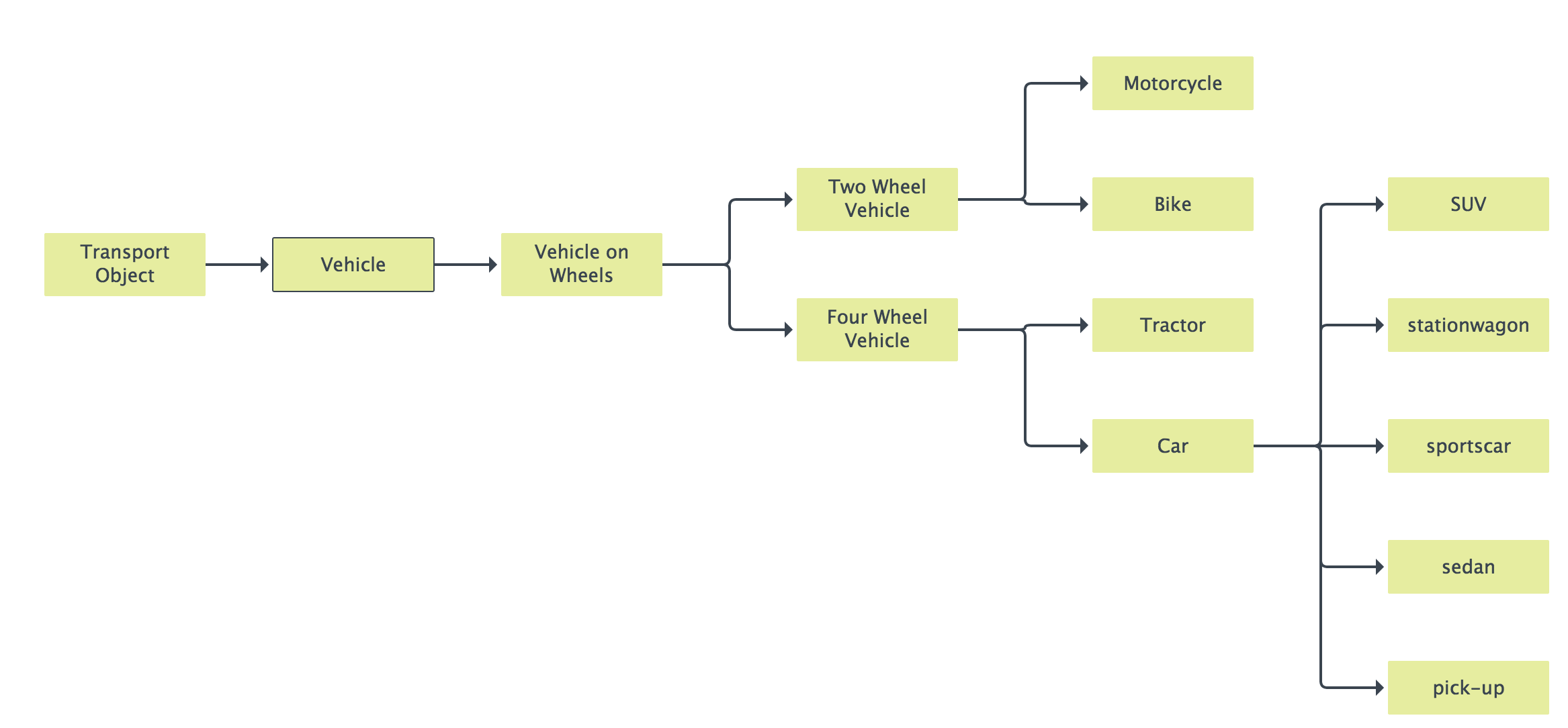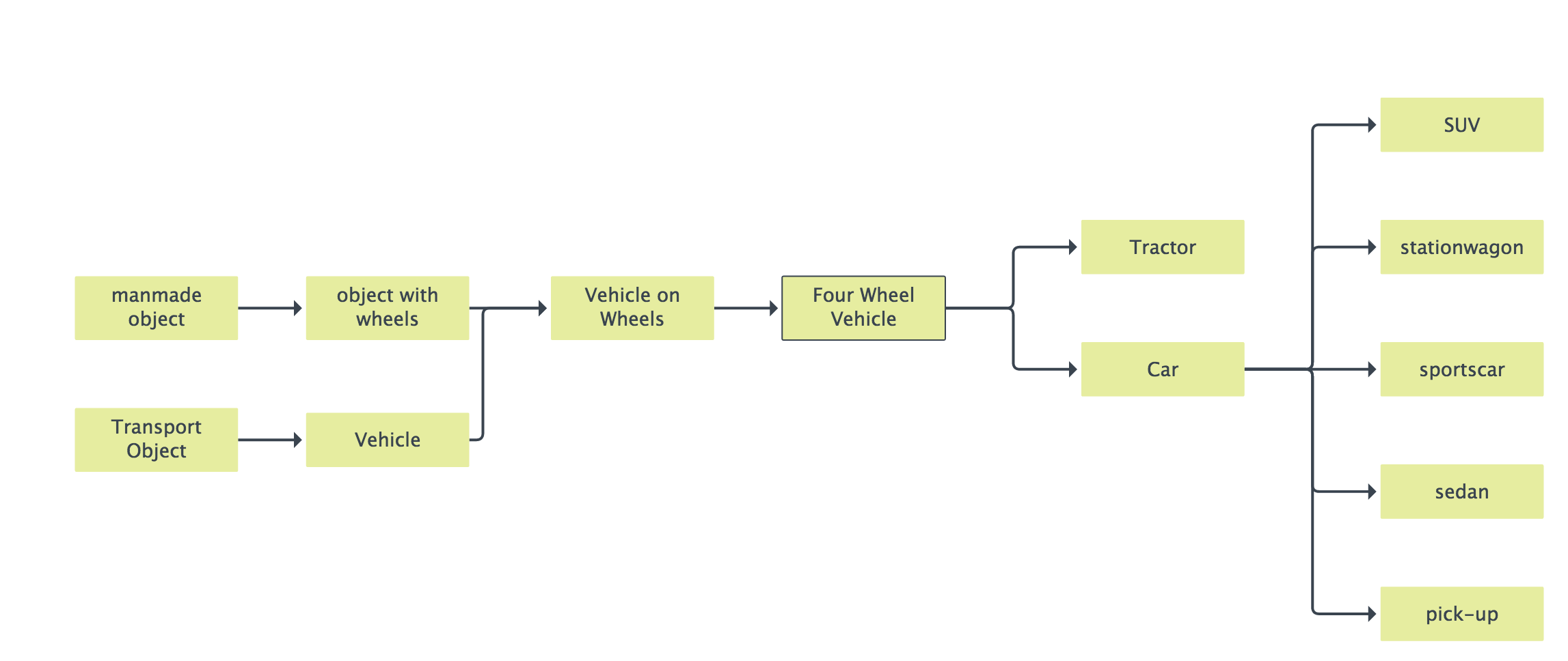 If you jump to Vehicle, you see that the diagram has changed for the Vehicle on Wheels node. This node no longer has the upstream relation to object with wheels, but the relation to Two Wheel Vehicle is added.