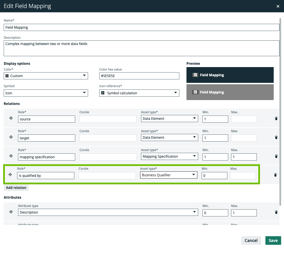 Column assets relate to Business Attribute assets that are related to Business Qualifier assets. The out-of-the-box relation types are the following: