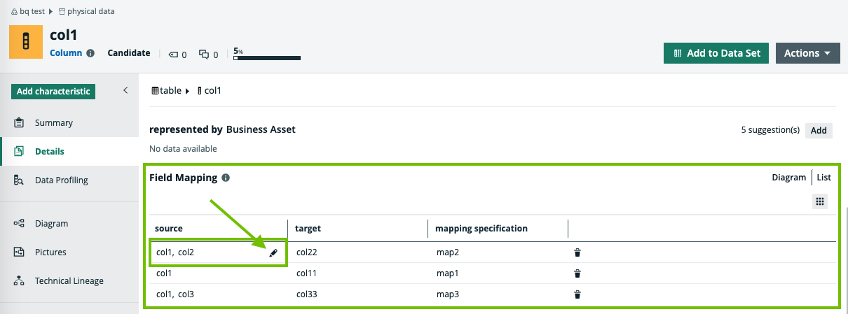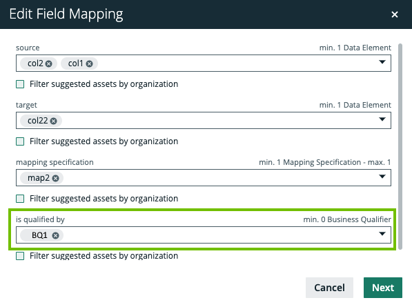 1. Edit the relevant complex relation type, for example, Field Mapping. Specifically, you need to add a relation leg pertaining to the Business Qualifier asset.
