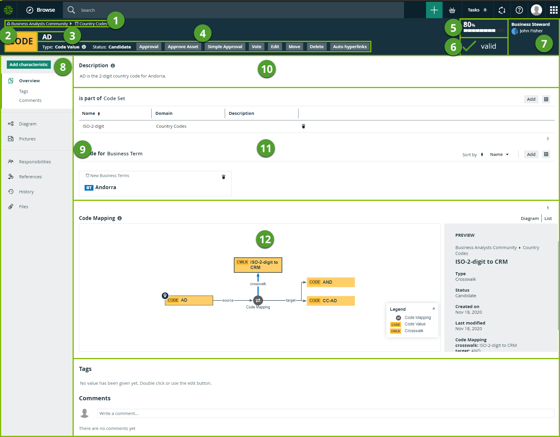 An asset page provides an overview of information about an asset, based on the assignment of its asset type. The assignment determines which and how many elements are added to the asset page by default. For example, the attribute Technical Data Type is relevant for a Column asset but not for a Business Term asset. Therefore, this attribute is assigned to Column assets and not to Business Terms.