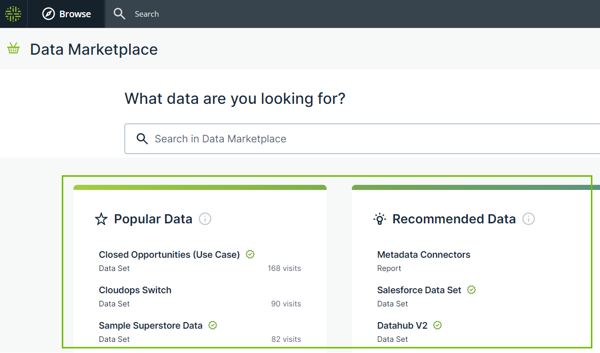 Asset recommendations are shown on the homepage and Data Marketplace. In the following example, the asset recommender shows popular and recommended data in Data Marketplace.