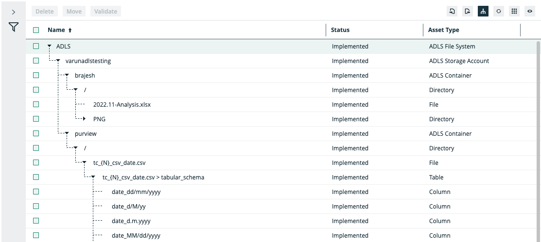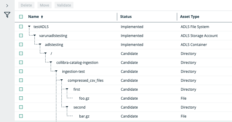 After you have synchronized the data, the integration of the Azure Data Lake Storage file system is completed, and the resulting assets are available in the domain that was specified in the crawler. The status of assets depends on the selected value in the Default Asset Status field in the capability.If No Status is selected, newly created assets receive the first status listed in your Operating Model statuses, and existing assets keep their assigned status.If Implemented is selected, all assets receive the Implemented status.
