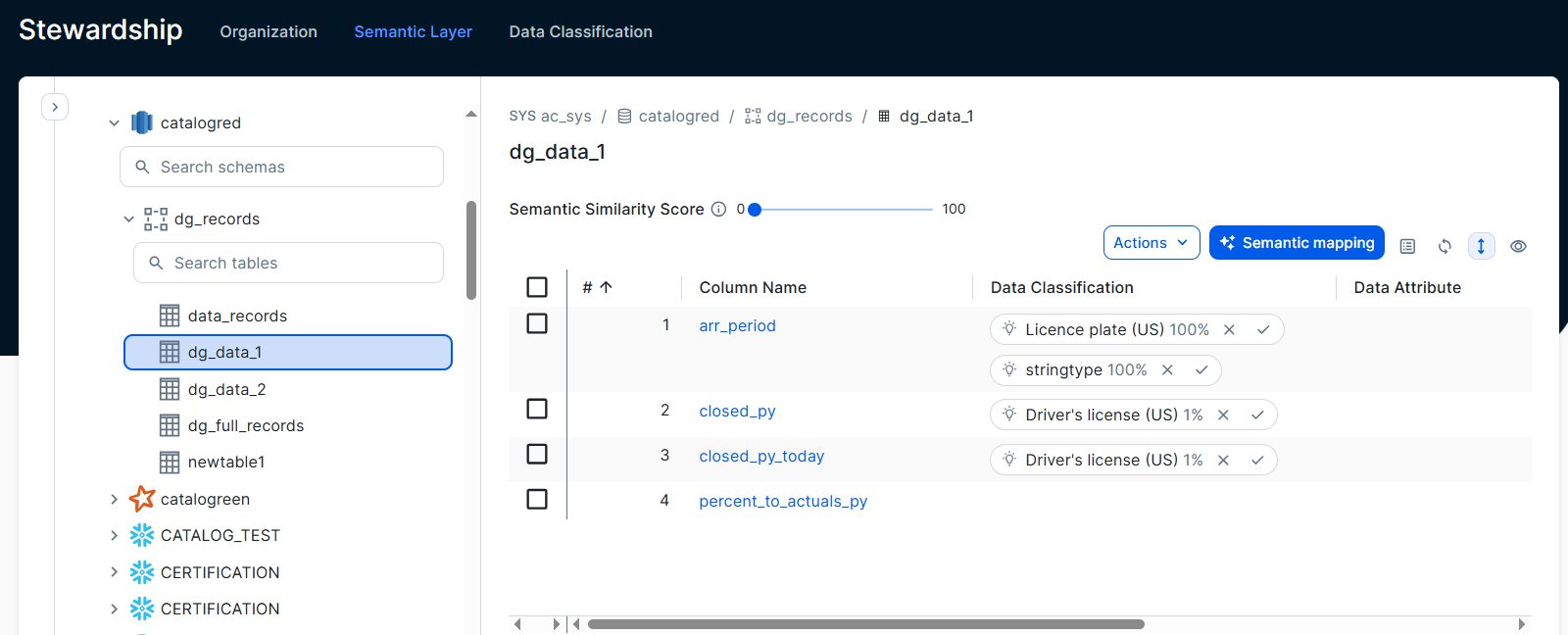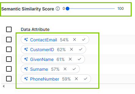 You can adjust the Semantic Similarity Score slider to show only suggestions with similarity scores above a specific value.You can then accept or reject the Data Attribute suggestions.