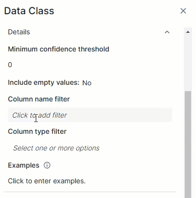 The Column name filter allows you to limit a data class to specific columns based on their name in the data source. The data class is considered only if the column's name in the data source matches one of the regular expressions in the filter.