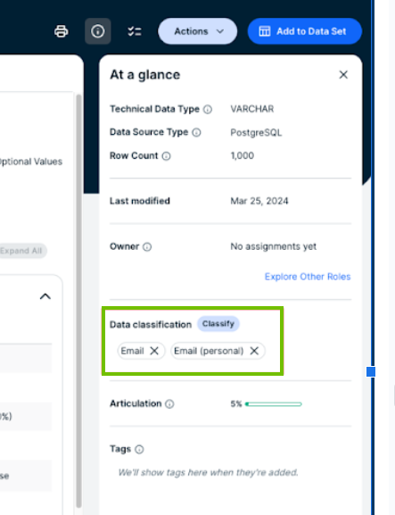In this case, we have registered a column called “pem” that contains customer email addresses. We also created a Data Category asset called “Personal Identifiable Information”. We have set up Unified Data Classification and have imported the out-of-the-box data class “Email” and “Email (personal)” in the Data Classification page. We have enabled the automatic classification acceptance feature in the classification settings.