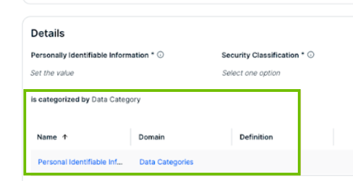 | Connect a data class with a Data Category asset from the Data Classification page or the Data Category asset page. |