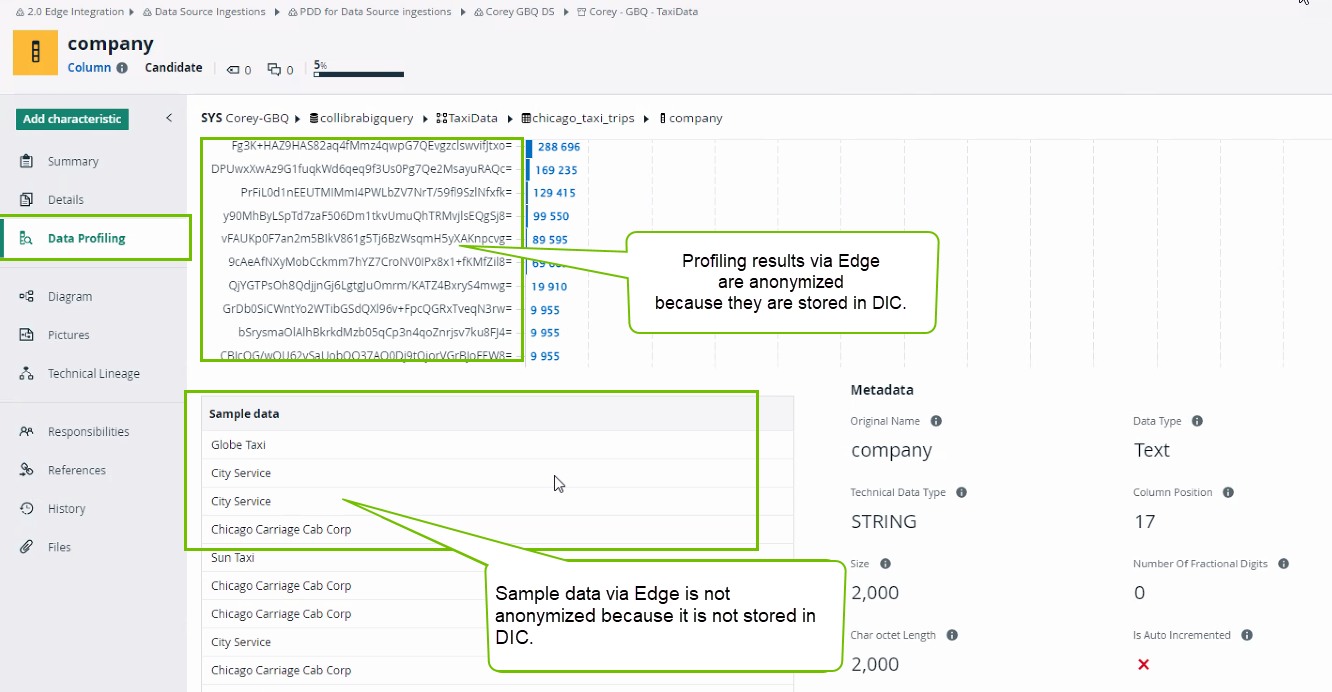 Note Edge detects the data type of a column during profiling and anonymizes the results only if the data type attribute is Text or Geo. However, if Edge detects a data type that doesn't correspond with the actual data type, data may not be anonymized or may have been wrongfully anonymized. You can update the data type in the Metadata tab of the Descriptive Statistics section on the Summary tab of a Column asset.