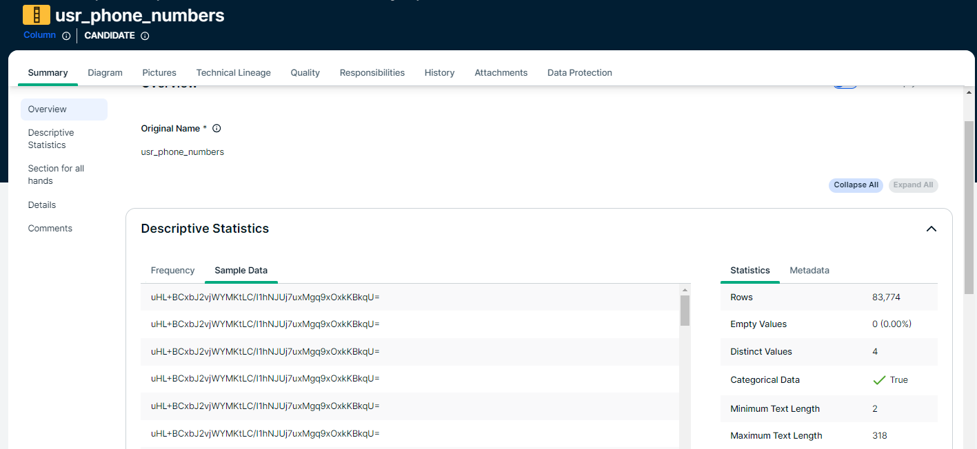 - Collibra anonymizes the content of columns with data of the type Text and Geo immediately at the end of the profiling process. As a result, data samples and the values that are shown in the data distribution charts are replaced by a random hash value for columns that contain these data types. Attributes that could contain sensitive data, like attributes of the type Mode or Percentiles, are no longer calculated for columns with data type Text or Geo.