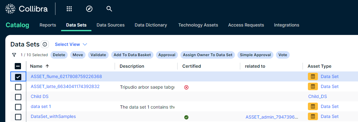 The Data Sets overview page contains the data sets that are available in Collibra Platform. You can view the data sets in tile display mode or table display mode.