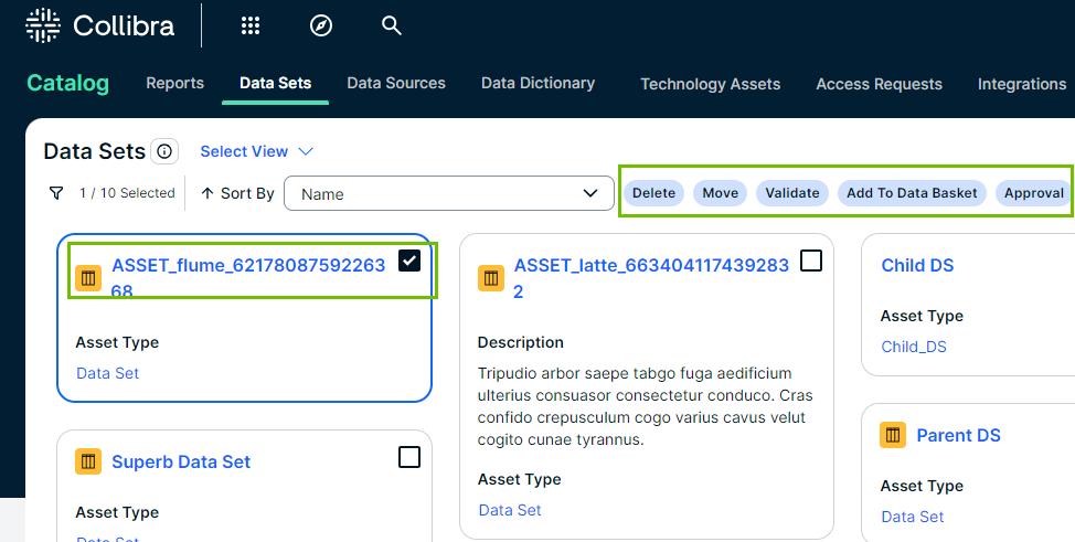 • Click anywhere in the tile except for the title to select the data set. Select the checkbox in the tile to select the data set.