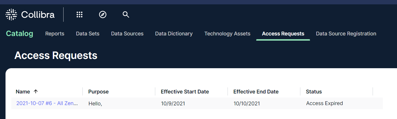 Tip The Data Usages domain is a hidden domain in the Business Analysts Community. This means it doesn't appear in the Collibra Browser, which helps to avoid it being inadvertently deleted. To view the Data Usages domain, go to the Access Requests page and click the name of a Data Usage asset. The Data Usages domain appears in the breadcrumb, on the Data Usage asset page.