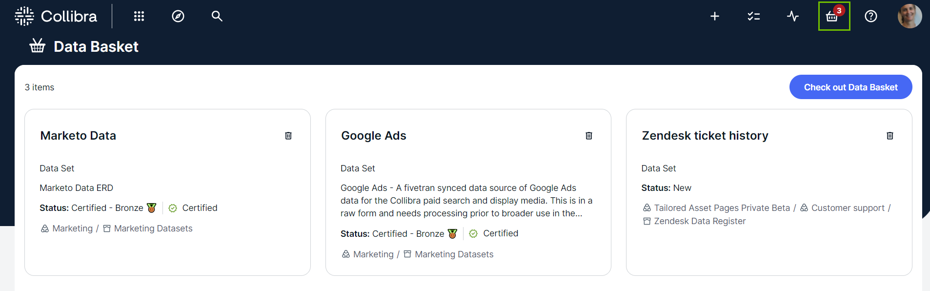 The data basket, also called shopping basket or shopping cart, allows you to add multiple assets from Data Marketplace or Data Catalog to a data basket and request access to those assets in bulk.