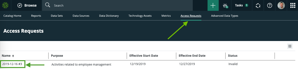 Important The Candidate status must be the first status in the Data Usage asset type assignment because it is required for the Request Assets Access workflow to allow users to check out their data basket and proceed in the workflow. For details on how to edit an asset type assignment, go to Manage asset type assignments.