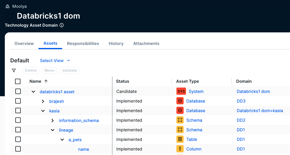 To move all resulting assets to another location permanently, select another System asset in the current synchronization configuration or create a new capability with a synchronization configuration that integrates the data in the new location.ExampleYou created System asset A in Domain A and synchronized Databricks. As a result, Table A and Column A have been added to Domain A. Then, you manually moved Table A and column A to Domain B.