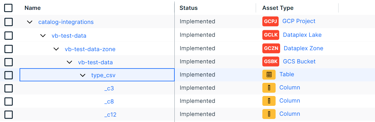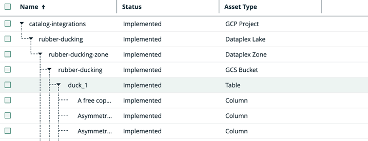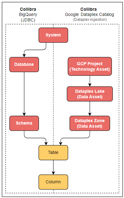 The Google Dataplex ingestion is based on Dataplex and results in assets that represent the projects, lakes, zones, tables, and columns.