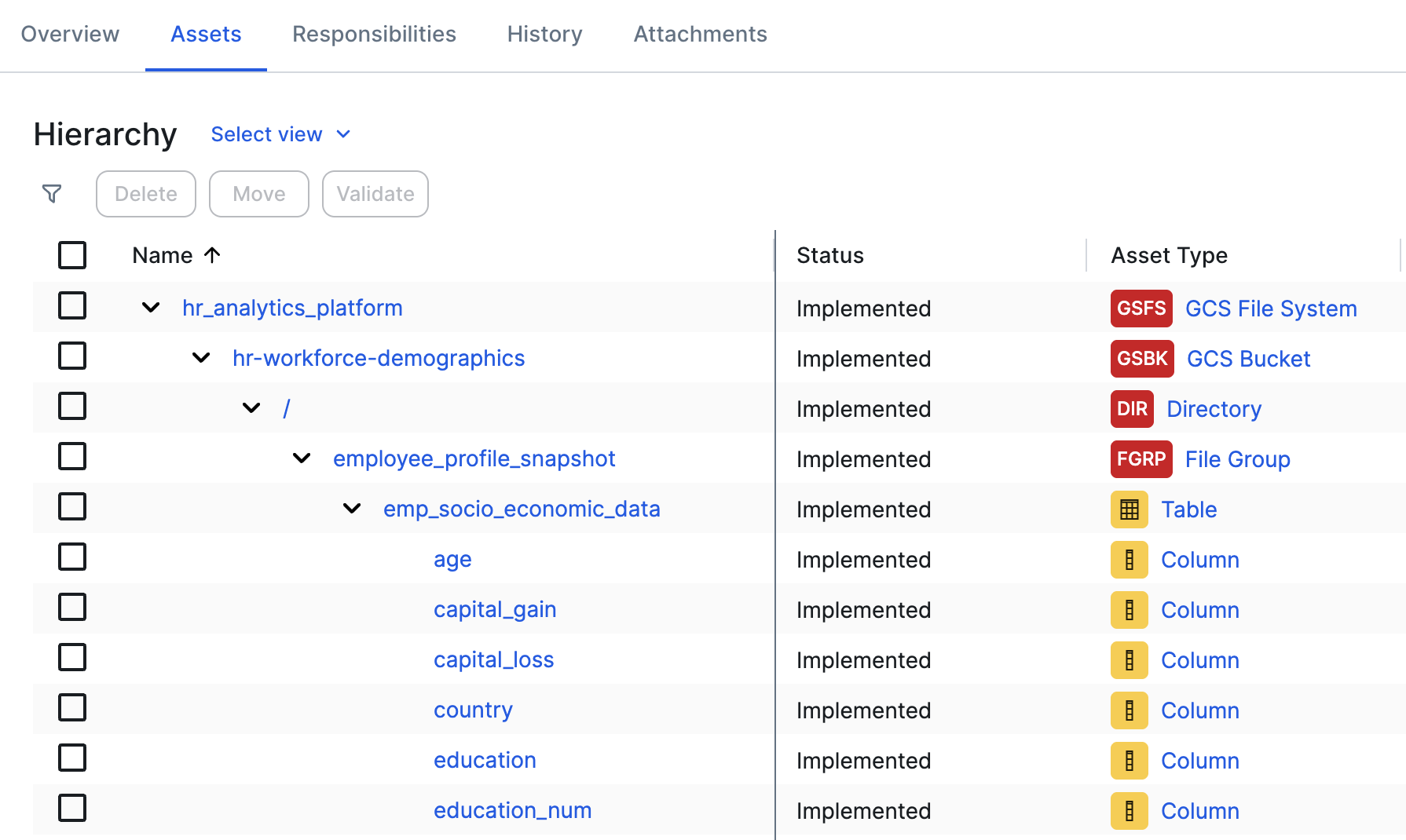 After synchronization, the directories and files of the GCS file system are represented in Collibra by specific asset types, retaining the original names.