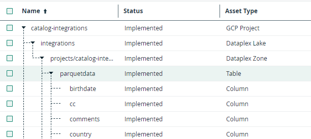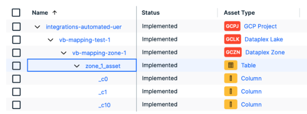 The integration will create the whole asset structure, representing Dataplex objects such as Project, Lake , Zone, Table, Column, and allows for filtering based on Lakes and Zones. |