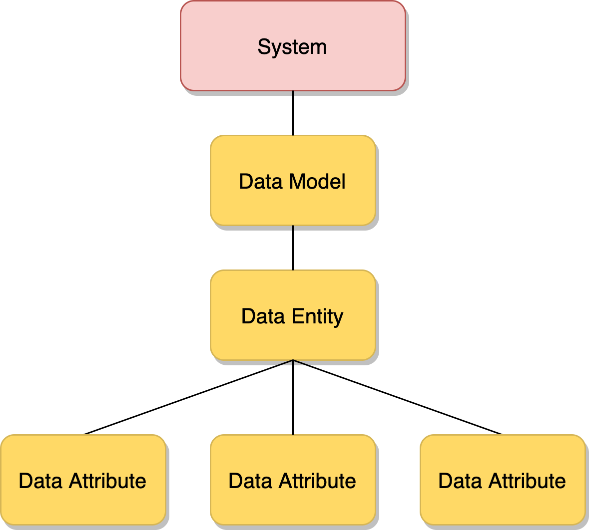 The logical data layer can be visualized as a tree-like structure, starting with a high-level System and Data Model assets, and branching out with implementation-specific Data Entity and Data Attribute assets.