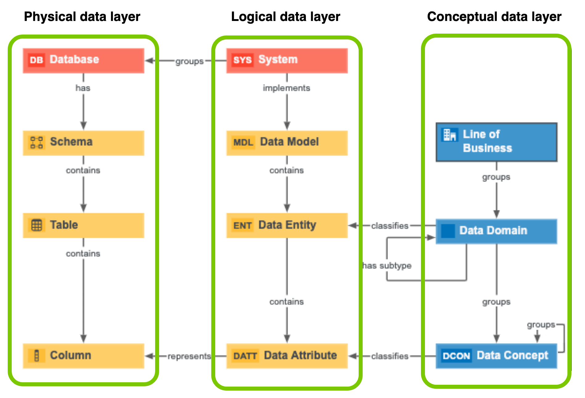 - The conceptual data layer represents the overarching structure of objects and elements in your data landscape.