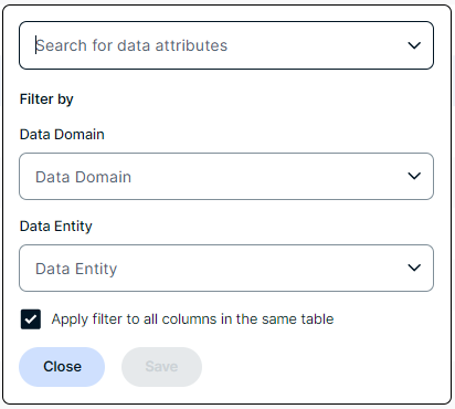 The Data Attribute asset linked to the Column asset via relation type "Data Attribute represents / represented by Column". When you filter on a Data Domain or Data Entity, the other drop-down lists dynamically update to only show content that relates to your filter. You can select the Apply filter to all columns in the same table checkbox to use the same filters to link a Data Attribute to other Column assets in the same table.