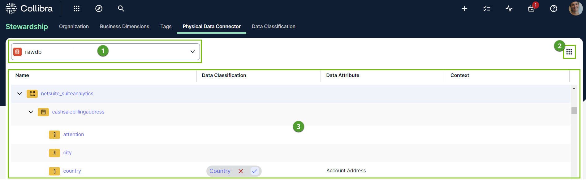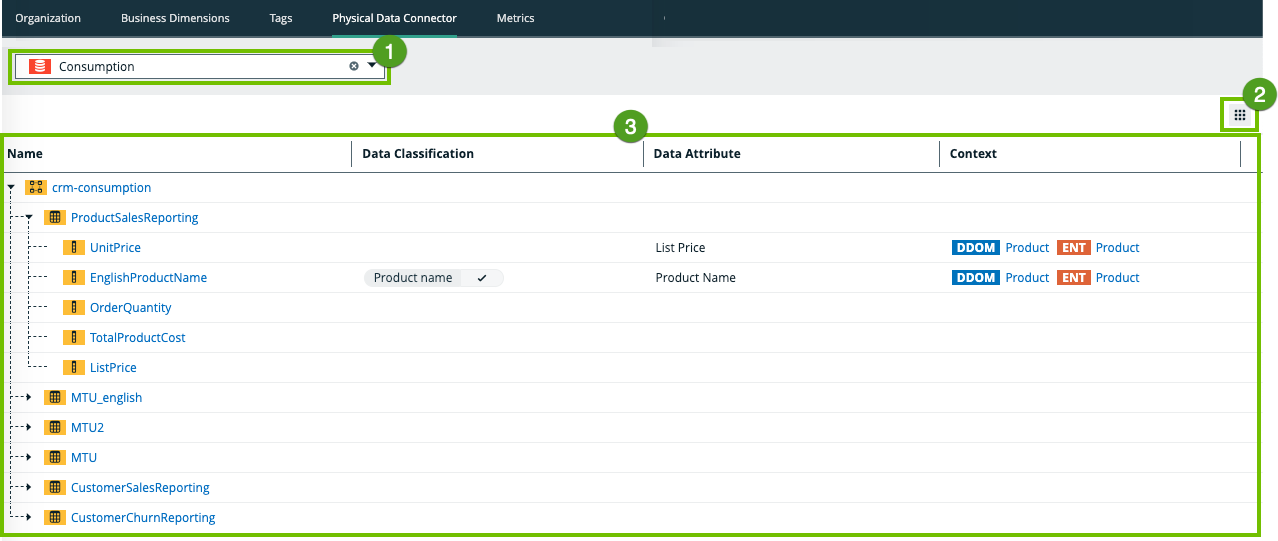 The Physical Data Connector shows a table with a high-level overview of database information. The table has a tree-like structure that enables you to drill down to the column level of a database. It shows the connection between the physical layer and the logical layer (semantic layer) and enables you to find Data Attribute assets that relate to individual Column assets.