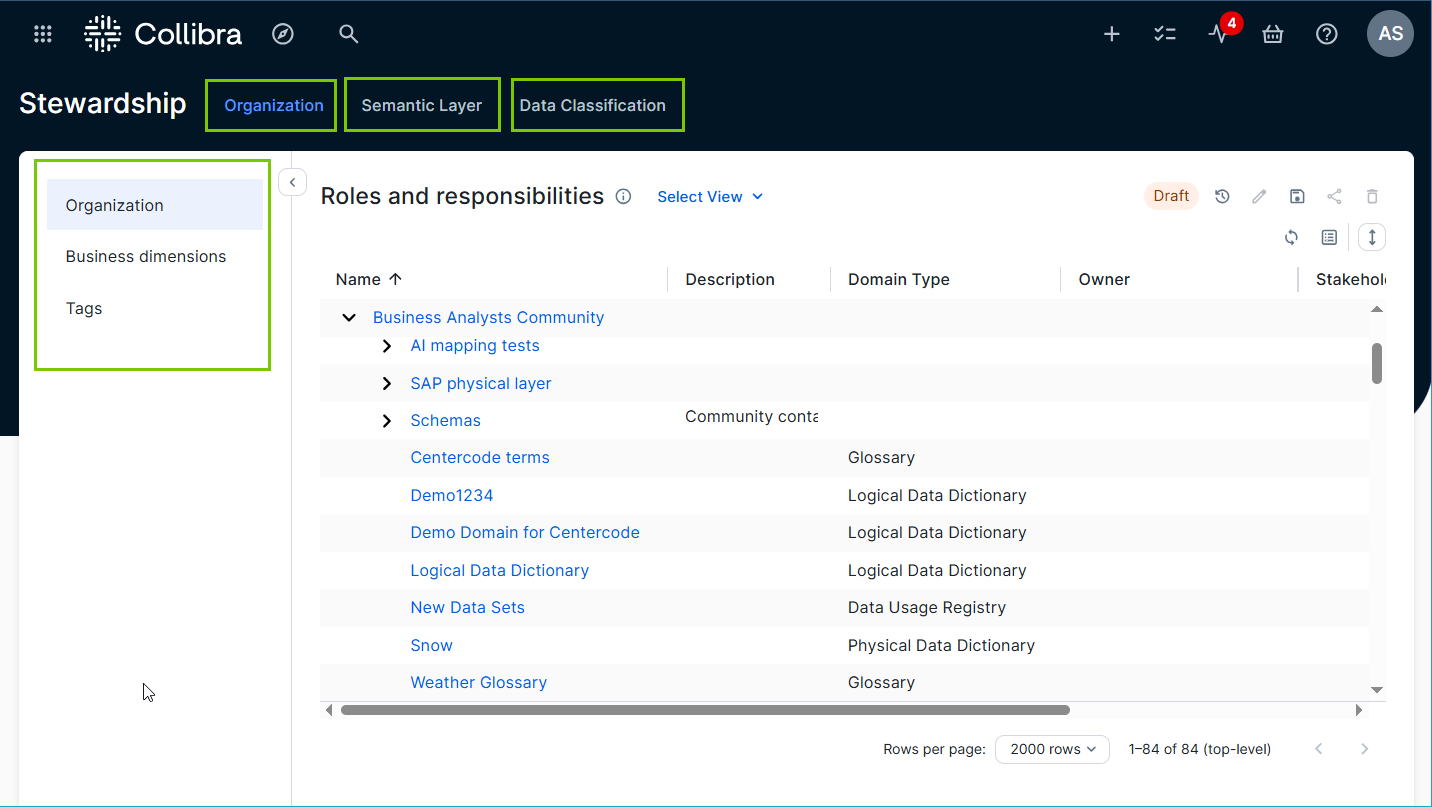 The Organization submenu gives a clear picture of the responsibilities within the data governance structure. It helps data stewards manage their tasks by providing a clear view of responsibilities within the organizational structure and offering features to support the creation of the organization's data governance framework. It includes the following pages: