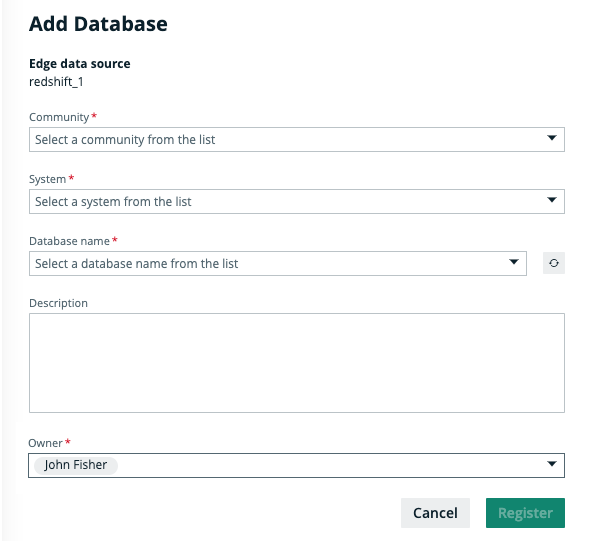 Tip By default, this field is called Owner, referencing the out-of-the-box Owner resource role. If you change the name of this out-of-the-box resource role, the updated name will be displayed instead. After the registration, a new domain and Database asset will be created specifically for this database in the community that you have specified. The user you select in this field will receive the responsibility for the domain. This ownership is then inherited by the Database asset. By default, the current user is selected. Note An owner must be associated with the Database asset for synchronizations to run. The owner can be changed later on, but should not be removed. |