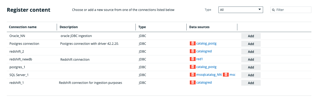 Click the Add button to add the connection to a database and register the data source. Click Register to register the data source for JDBC, S3, GCS, and ADLS integrations. |