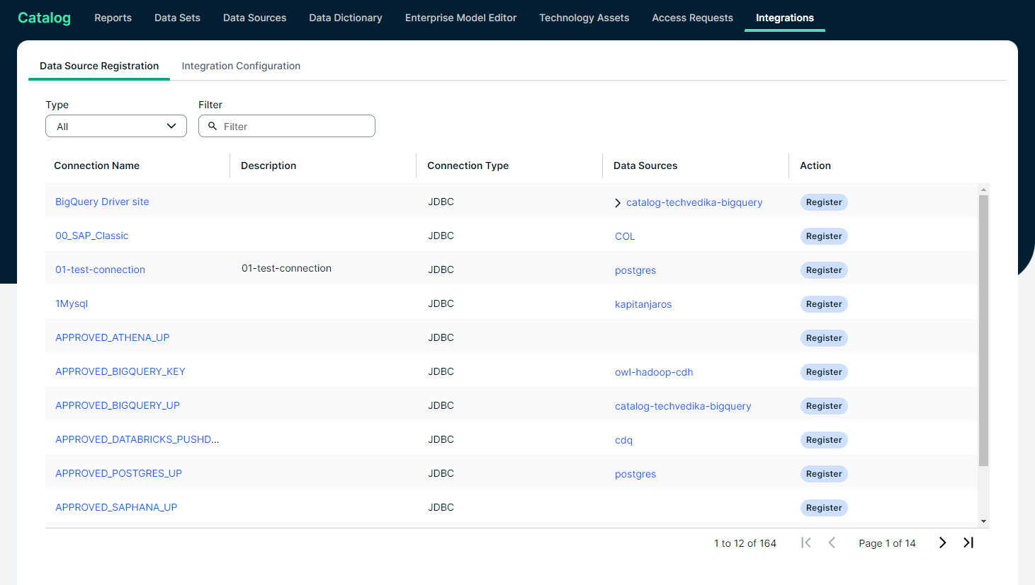 The Data Source Registration tab page is located in the Catalog Integrations submenu. It allows you to create a Database or File System asset from which you can start the synchronization of a data source. Use this tab page for JDBC, S3, GCS, and ADLS integrations via Edge.
